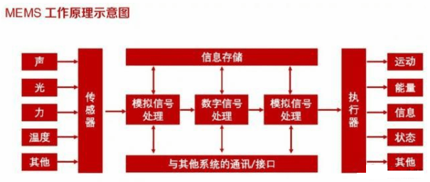 MEMS中的核心元件一般包含兩類:一個傳感器,以及一個信號傳輸單元。傳感器將外界信號轉(zhuǎn)換為電信號,執(zhí)行器與外界產(chǎn)生作用,信號傳輸單元能夠?qū)π盘栠M行處理以及與其他微系統(tǒng)連接。MEMS傳感器具有體積小、重量輕、功耗低、可靠性高、靈敏度高、易于集成等優(yōu)點,正在逐漸取代傳統(tǒng)機械傳感器。
