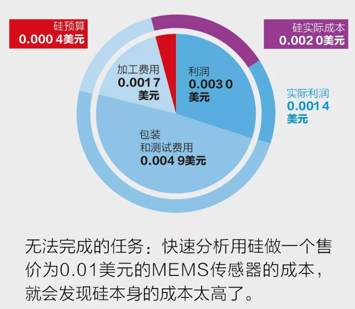 我們通過簡單的數學題來闡釋這一問題。(如果不想看,可直接跳至下一段。)如果1平方毫米的傳感器的售價為0.01美元,那么制造商制造該傳感器的成本不應超過0.007美元,因為大多數制造商希望在銷售該傳感器時至少能獲得30%的利潤率,即0.003美元的利潤。根據當今制造傳感器的經驗法則,MEMS芯片的成本約為最終傳感器成品成本的30%,其余70%的成本用于傳感器的包裝、測試、電子數據讀出和校準。因此, MEMS芯片的成本就只能為0.007美元的30%,即約0.002美元。最后,硅材料大約占未包裝MEMS芯片成本的20%。這留給傳感器硅的預算僅為0.000 4美元。
