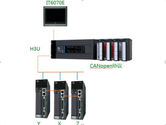 采用匯川H3U PLC與伺服之間采用Canopen通訊,采用以太網實現觸摸屏與PLC之間的通訊,采用手搖輪直接接入伺服CN1端子以AB相4倍頻進行手動控制,觸摸屏采用本機地址進行上萬組配方處理