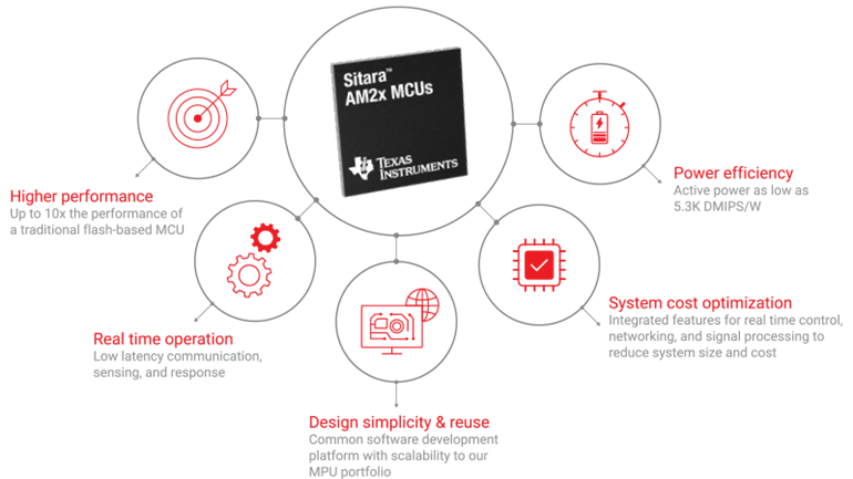 自動化工廠和智能汽車的進一步發展需要高級聯網、實時處理、邊緣分析和更先進的電機控制拓撲。這些功能的加入使得對高性能微控制器 (MCU) 的需求快速增長,這種微控制器需要超越傳統MCU并提供類似處理器的功能。本文將介紹高性能Sitara? AM2x MCU幫助設計工程師克服當前和未來系統挑戰的五大特性,如圖1所示。